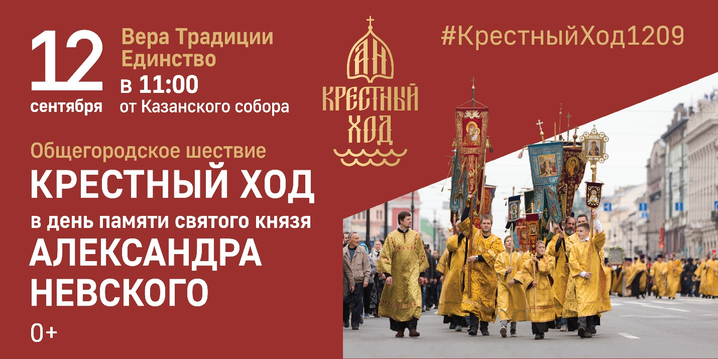 Дорогие братья и сестры! Призываем вас прийти 12 сентября к Казанскому собору и всем вместе принять участие в праздничном крестном ходе в честь небесного покровителя Санкт-Петербурга, святого благоверного князя Александра Невского.