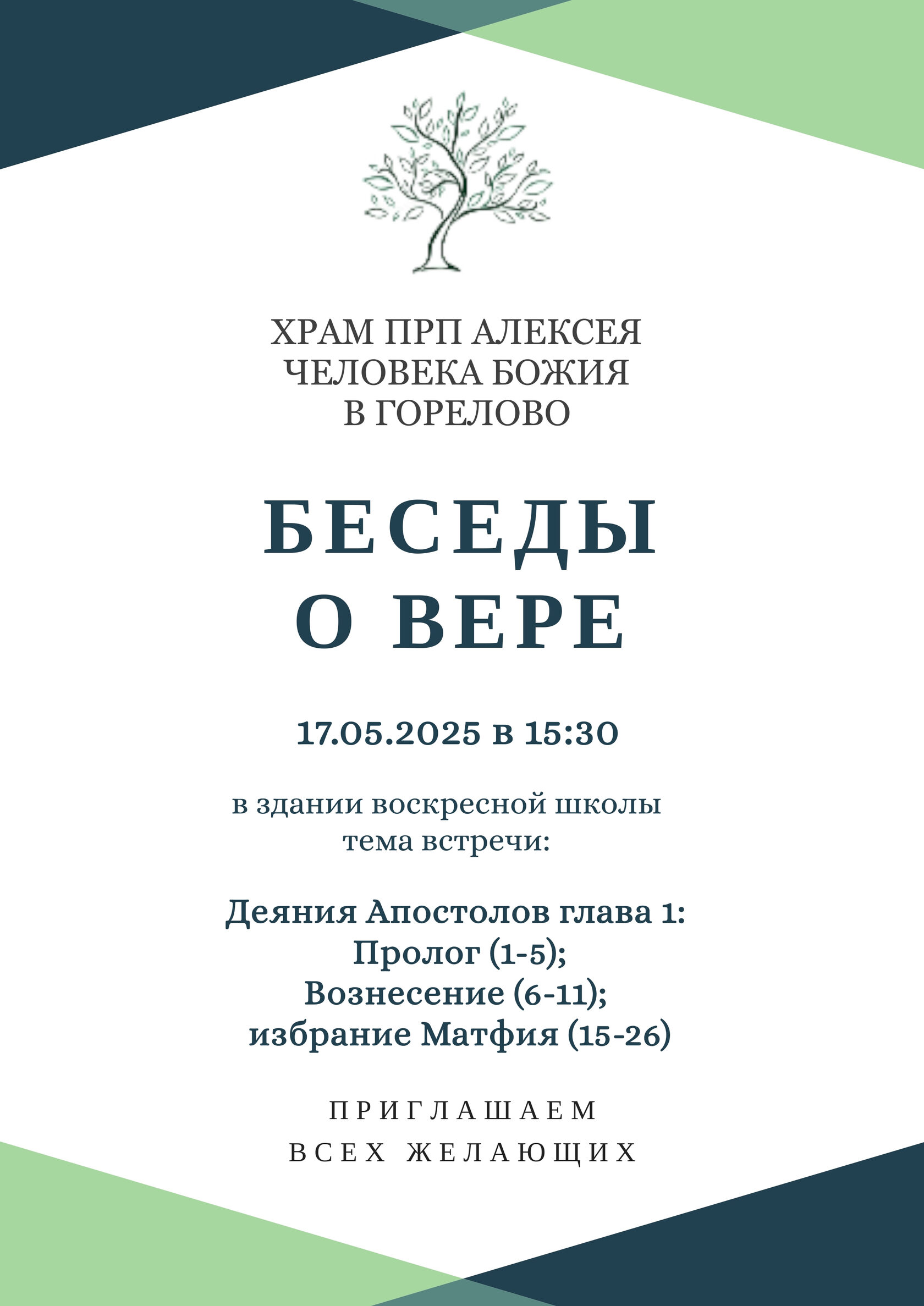 Тема ближайшей встречи 17.05.2025 в 15:30: Деяния Апостолов глава 1: Пролог (1-5); Вознесение (6-11); избрание Матфия (15-26).