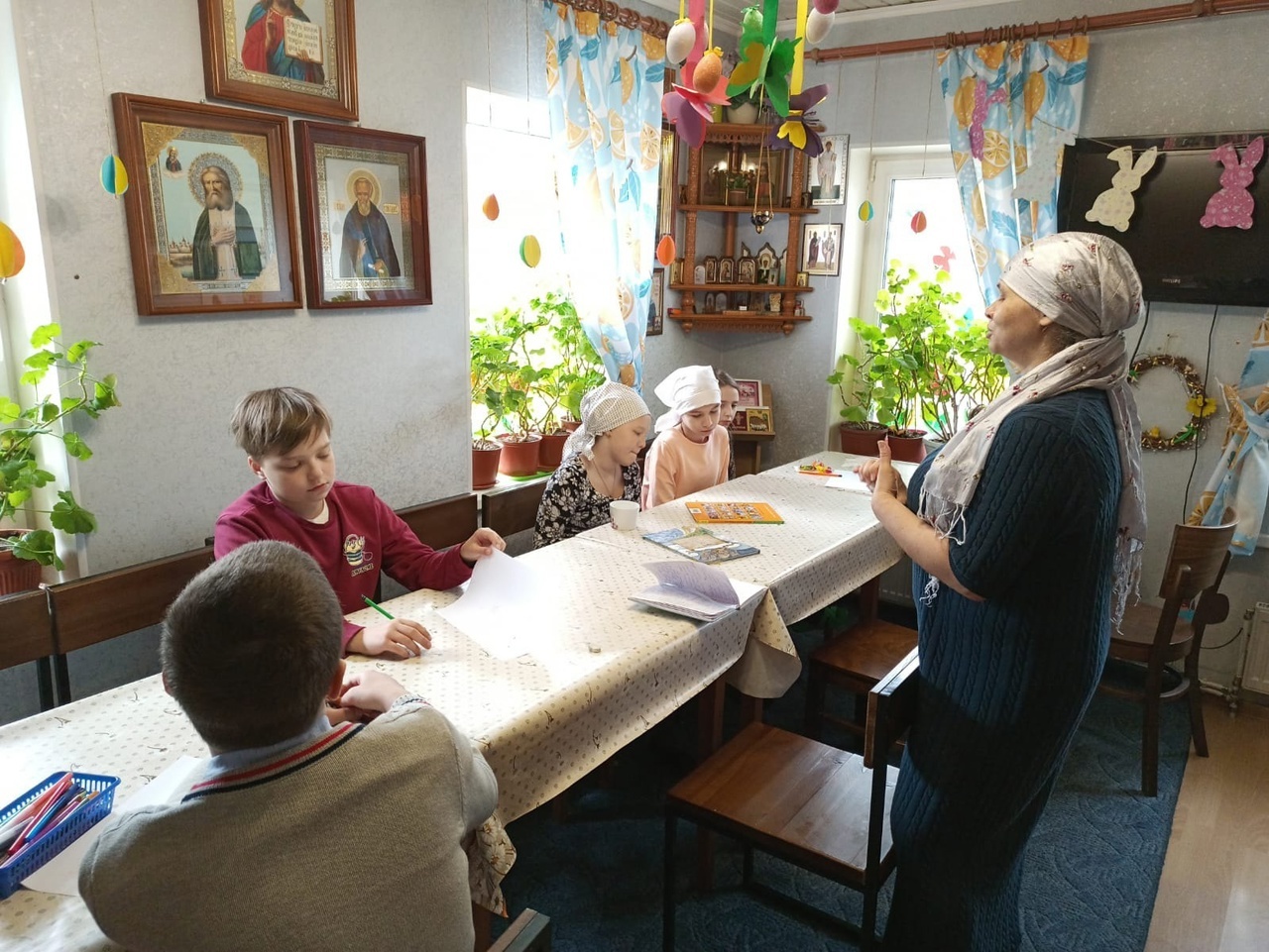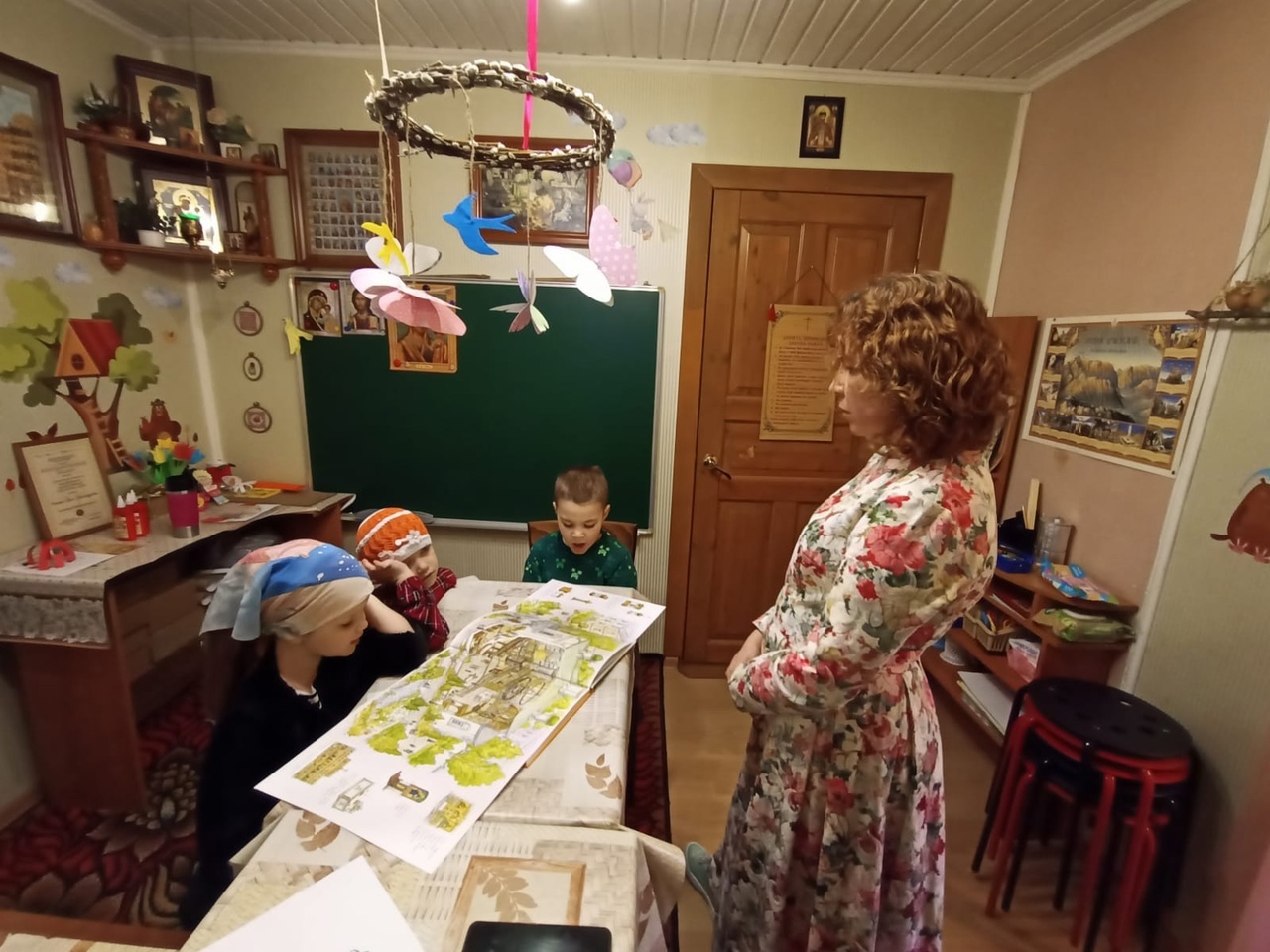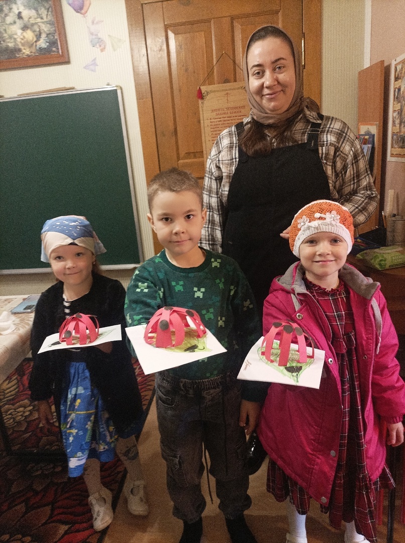 Первый урок в младшей группе провела Анна Александровна. Сегодня мы повторяли пройденный материал за год по циклу занятий " Храмоведение".